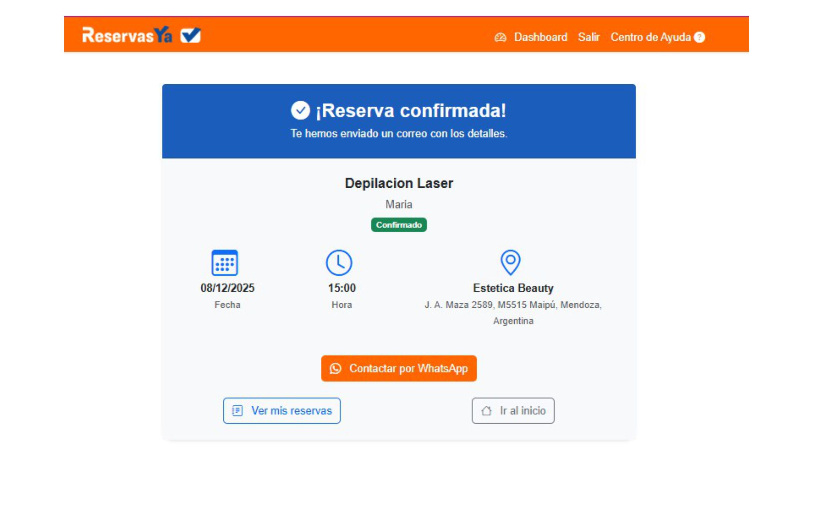 Descubrir cómo funcionaTu negocio disponible las 24hs para recibir reservas, el cliente reserva, vos recibis una notificacion y no tenes que estar detras del whatsapp o el telefono. Todo automatizado y configurado en base a tus horarios de atencion. Sin registro, rapido y sencillo
